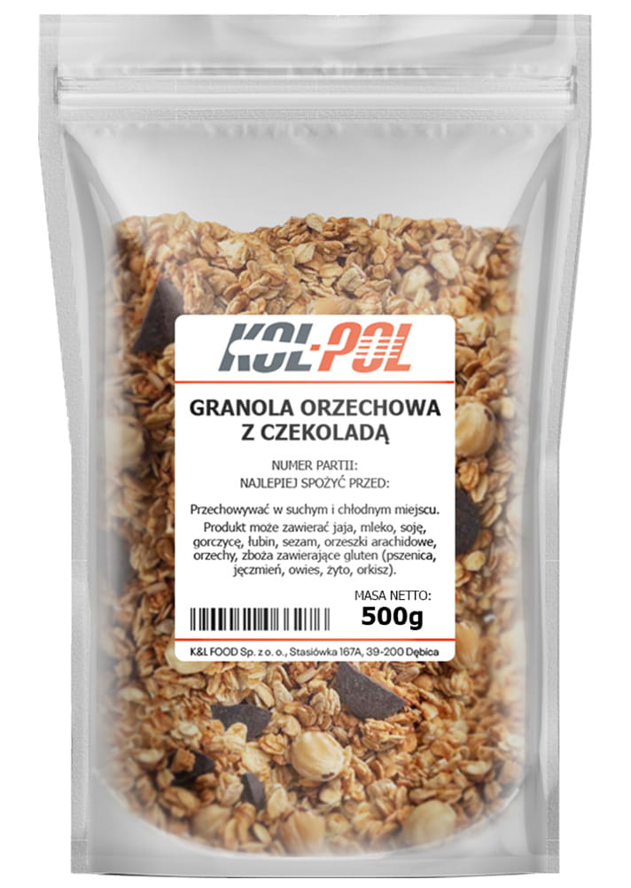 Granola orzechowa z czekoladą to pyszna i pożywna mieszanka wypiekanych płatków owsianych, orzechów i delikatnej czekolady mlecznej. Jej chrupiąca struktura i wyjątkowy aromat sprawiają, że idealnie komponuje się z mlekiem, jogurtem czy deserami, dostarczając przyjemności z każdym kęsem.